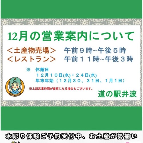毎日沢山のご来店ありがとうございます 道の駅 いなみ 木彫りの里です☺️ 当道の駅は毎月、第二第四水曜日は休館日です 引き続き当道の駅をよろしくお願い...
